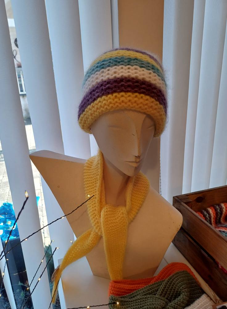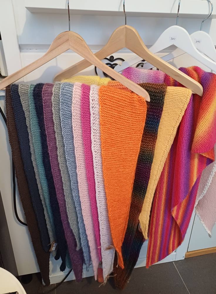 Myke, gode barneklær ofte fargerike og glade, men også noen litt dusere. Ullpannebånd til dame, ellers luer og pannebånd til barn. Litt dukkeklær har jeg også. Samt toalettmapper.